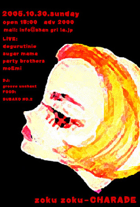 大成功に終わった「朱夜」から一ヶ月。 シャングリラにシューガーママ登場。 第三回目を迎える恒例イベント「シャレード」。 今回も色とりどりの個性あふれるラインアップ。 さらにカフェ「巣バコ」がフードブースを出店! 秋の日曜、とことん楽しんでください!! ---------------------------------------------- 10月30日(日) 『続続シャレード』 LIVE: デグルチーニ http://osaka.cool.ne.jp/deguruechienie/ Sugar Mama http://feelsugarmama.loops.jp/ PARTY BROTHERS(from The Miceteeth) http://www.miceteeth