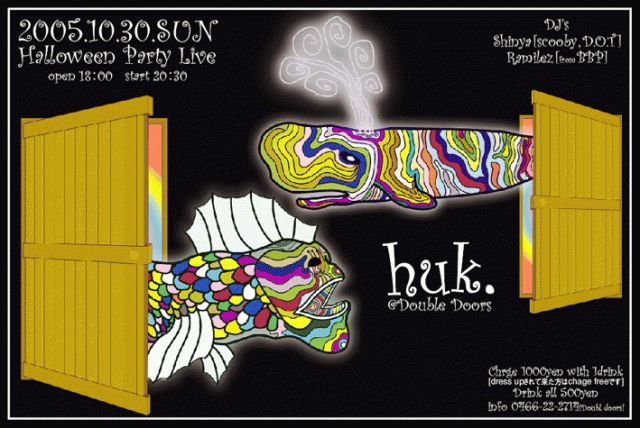 来る10/30(sun)藤沢Double Doorsにてハロウィンパーティーのお誘いが有ったみたいなので、huk.の皆さん乗り込んじゃうことにしたみたいです。 2005.10.30(sun) @Double Doors open 18:00 start 20:30 -DJ- shinya[scooby/D.O.T] ramilez[fromBBP] charge=1000yen with 1drink dress upされて来た方はcharge freeです。 drink&food all 500yen さっさと着替えて飲みに行きなさい!!