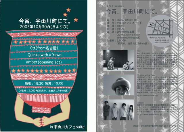個人的にライブで観てみたかった組み合わせだったので、 急遽、こんな演奏会を企画しました。 今回は、名古屋からコンテンポラリー・俳句ポップスと 喩えられることも多い「Ett」を迎え、東京と名古屋の一押しのアーティスト達が、 この日、渋谷・宇田川町のカフェで演奏します。 各アーティストの演奏時間も長めにとってますので、 ユルい秋の夜を感じにきてください。 まだ、Ettを聴いたことが無い方、下記で試聴ができるようです。 よかったら聴いてみてください。ライブはもっと伝わってきます。 http://www.mercato.co.jp/ett.h