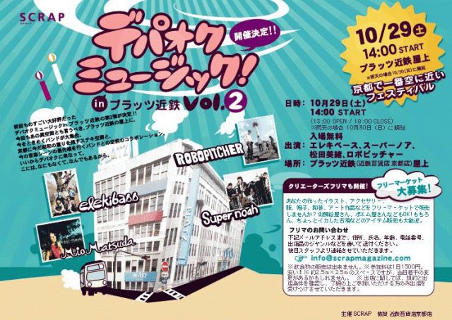 『デパオクミュージック Vol.2』 【出演】エレキベース、松田美緒、super noah、ロボピッチャー 【時間】open 13:00 start 14:00 close 18:00 【料金】無料!! 【詳細】SCRAP(http://www.scrapmagazine.com) にしき屋(075-211-4879) ※雨天が予想される為、10/30(日)に順延になりました。