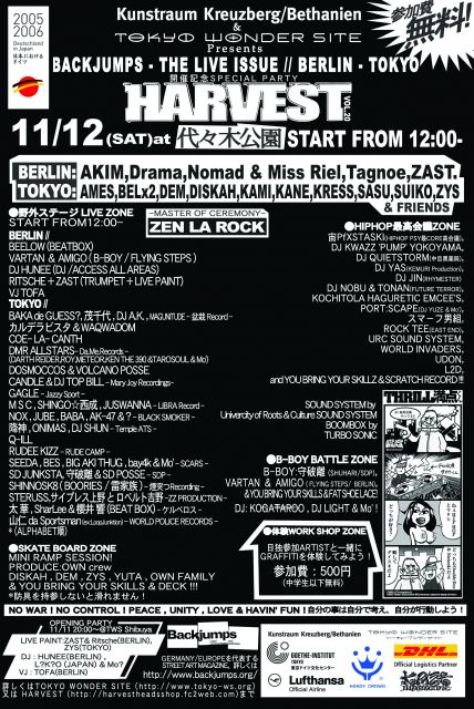 TOKYO WONDER SITE & Kunstraum Kreuzberg/Bethanien 主催 "BACKJUMPS-LIVE ISSUE // BERLIN-TOKYO " 開催記念 SPECIAL PARTY ! "HARVEST Vol.20 〜HIPHOP最高会議〜 " 11/12(土曜) 12:00- 20:00 代々木公園 野外ステージ イベント BERLIN&TOKYOから最新のSPECIALIST達を招集 代々木公園を舞台に繰り広げられる新しい試み HIP HOP = ALL MIX = カッコ良ければ良いじゃん の 感覚 (ステージ以外は)飛び入り歓迎! 2005 日&独 秋の大収穫祭! --------------------------------------------------------