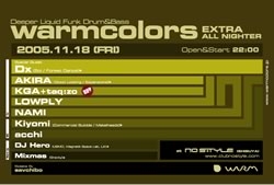 11月のwarmcolorsは毎回行っている第一日曜日夕方ではなく11/18(金)にwarmcolors初となるオールナイトバージョンで、 ゲストDJに日本を代表するドラムアンドベースDJのDx氏を招いて行います。 皆様お楽しみに♪ warmcolors extra all nighter 2005.11.18[fri] @nostyle Extra Guest: Dx (Soi/Forest Dance) dj: akira(good Looking/expansions) kga & taqzo (b2b) lowply nami warm up dj: DJ Hero (USMD, Magnetik Space Lab, LA) Mixmas (Gravity) mc: kiyomi acchi Food: savchibo charge door : 2000Ye