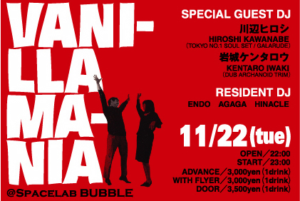VANILLA MANIA @BUBBLE(水戸市泉町) http://www.bubble-mito.com Date:2005.11.22(Tue) Open 22:00 Start 23:00 DJ : ENDO AGAGA HINACLE   (from 秘密の宮廷ゴールデンタイム) Special Guest DJ : 川辺ヒロシ(Tokyo No.1 Soul Set/Galarude) http://www.skylarkin.com http://www.t1ss.net/ 岩城ケンタロウ(Dub Archanoid Trim) Day :\3,500(1d) Adv :\3,000(1d) With Flyer :\3,000(1d) With マピナビ :\3,000(1d) お問い合わせ:Space Lab BUBBLE 029-303-1331 info@bubble-mito.com 多くをコメン