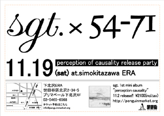 ROCKという大きな概念にクラシカルな展開とスピリチュアルな要素、そして NOIZE、EMO、JAZZ、即興音楽 等が融合したインストバンド"sgt."が、1stミニアルバムの発売を記念し"54-71"を迎えイベントを開催します。 ◆sgt.1st mini Album『perception of causality』release party!!!◆ 11/19(sat)@下北沢ERA open&start/19:00 ad/door \2000/\2800 【LIVE】 sgt. http://www.penguinmarket.org/sgt./ http://mixi.jp/view_community.pl?id=391116 54-71 【lounge】 珠洲 http://www.ismusic.ne.jp/suzu/
