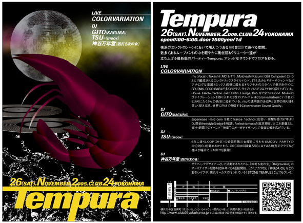 横浜のエレクトロシ-ンにおいて増えつつある((音))で遊べる空間。数多くあるム-ブメントの中を軽やかに動き回るクリエイタ-達が立ち上げる最新のパ-ティ-TEMPURA。アシッドなサウンドでフロアを彩る。