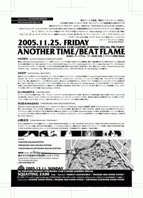 現在開催中の現代アートの祭典「横浜トリエンナーレ 2005」。その会場内で放送しているミニFM局「FM-ヨコトリ」にて毎週金曜日に放送されている横浜のオルタナティヴなクラブ・カルチャーを紹介する「YOKOHAMA CLUB CLUTURE JAMMING」。そのスペシャル・ヴァージョンが12月11日(日)日本大通りにある「ZAIMビル」(旧関東財務局ビル)にて3フロア、3サウンド