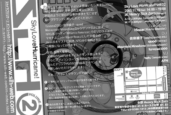A/D \2,500(woman \2,000) W/F \2,000(woman \1,500) ■Guest Live Hase(Khaotic dimension) ■DJ 佐宗綾子(sampling masters AYA) quad(luvtrax) Masayoshi Minoshima tuvasa2000 ■VJ tats(tomoyuki arima) AFN ■Flyer Desing qzna ボディコンを持参か着てきた女性はドリンク代の500円のみで入場できます!実質入場料タダ!