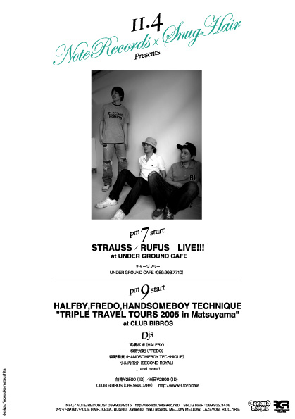 告知宜しくお願いします。 NOTE RECORDS×SNUG HAIR presents ”HALFBY,FREDO,HANDSOMEBOY TECHNIQUE "TRIPLE TRAVEL TOURS 2005" in Matsuyama” ◎11/4(金)松山CLUB BIBROS(089.948.0788) ◎OPEN 21:00/前売\2500(1D)/当日\2800(1D) ◎DJ/高橋孝博(HALFBY)、松野光紀(FREDO)、森野義貴(HANDSOMEBOY TECHNIQUE)小山内信介(second royal) with菅 俊視(SNUG HAIR)、ケンタ、ma-c、村上、片山 ◎チケットの問合せ、販売 NOTE RECORDS http://records.note-web.net/ info_records@note-web.net ↑までメールください、送料無
