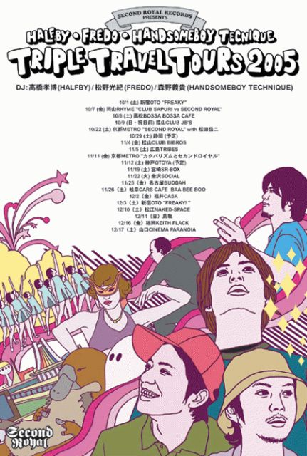 始めまして、愛媛県松山市のNOTE RECORDSやってます。大野です!!松山でのセカロイツアーの告知させてください!! NOTE RECORDS×SNUG HAIR presents ”HALFBY,FREDO,HANDSOMEBOY TECHNIQUE "TRIPLE TRAVEL TOURS 2005" in Matsuyama” ◎11/4(金)松山CLUB BIBROS(089.948.0788) ◎OPEN 21:00/前売\2500(1D)/当日\2800(1D) ◎DJ/高橋孝博(HALFBY)、松野光紀(FREDO)、森野義貴(HANDSOMEBOY TECHNIQUE)小山内信介(second royal) with菅 俊視(SNUG HAIR)、ケンタ、ma-c、村上 ◎チケットの問合せ、販売 NOTE RECORDS