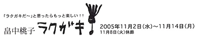 ラクガキだーと思ったらもっと楽しい 畠中桃子展 ラクガキ 子供時代に好きなものを自由に描いたように 肩の力を抜き、手が気持ちよく動くラインを描きます。 そうすれば、自分も見る方も気持ちがもっともっと楽しく なるのではないかと思って「ラクガキ」をテーマに描きます。 ぜひ「ラクガキ気分」を楽しんでください。 会場にはラクガキコーナーも有ります。 脚立に上がってぜひラクガキをしていってみて下さい。