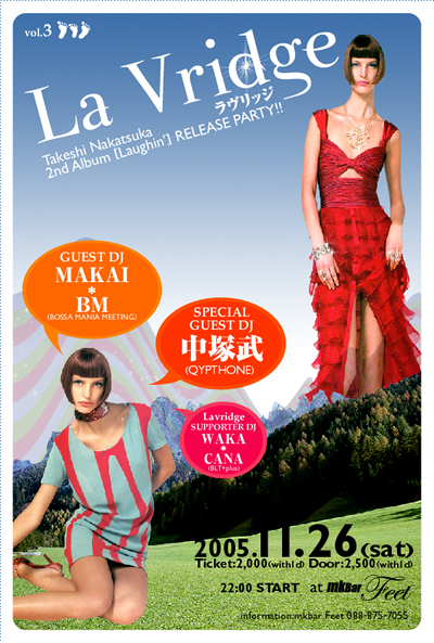 南国高知でイベントがあります!!! 今回はもう一人主役が!そうWメインイベントなのです!Mr.スタイリッシュことマカイさんもご一緒! オーガナイザーは高知の貴婦人ことソレイユさん! フライヤーデザインは高知のオサレ番長シバヤスヒロさん! このメンバーで盛り上がらないわけが無い!!!!!! お近くの方、是非!!!!!!!!!!!!!!! ○ChangeTheWorld -BMremix-○ http://www8.ocn.ne.jp/~bossa/change.rm ●○○●○○●○○●○○●○○●○ La Vridge presents「La Vridge」@mkbar Feet(Kochi) Takeshi Nakatsuka 2n