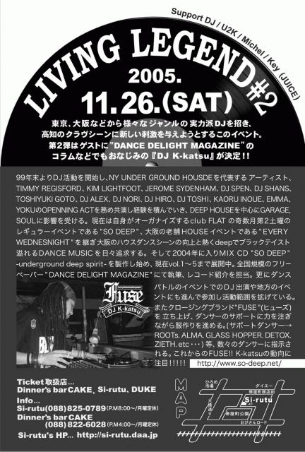 ▼Si-rutuプロデュースの新企画の第2弾!!! 全国各地から様々なジャンルの実力派DJを招き、高知のクラヴシーンに新しい 刺激を与えようとするこのイベント。 今回のゲストは大阪からDNCE DELIGHT MAGAZINのコラムでもおなじみの 『DJ K-katsu』が決定!! ▼DJ K-katsuプロフィール 99年末よりDJ活動を開始し、NY UNDER GROUND HOUSDEを代表するアーティスト、TIMMY REGISFORD、KIM LIGHTFOOT、JEROME SYDENHAM、DJ SPEN、DJ SHAN‘S、TOSHIYUKI GOTO、DJ ALEX、DJ NORI、DJ HIRO、DJ TOSHI、KAORU INOUE、EMMA、YOKUのOPENNING ACTを