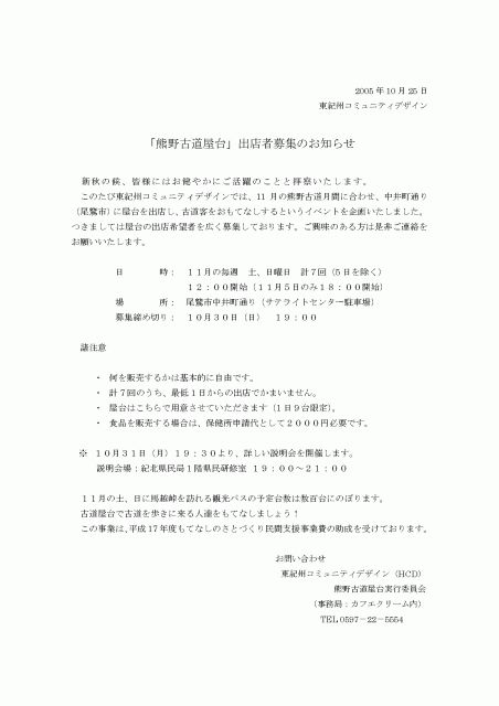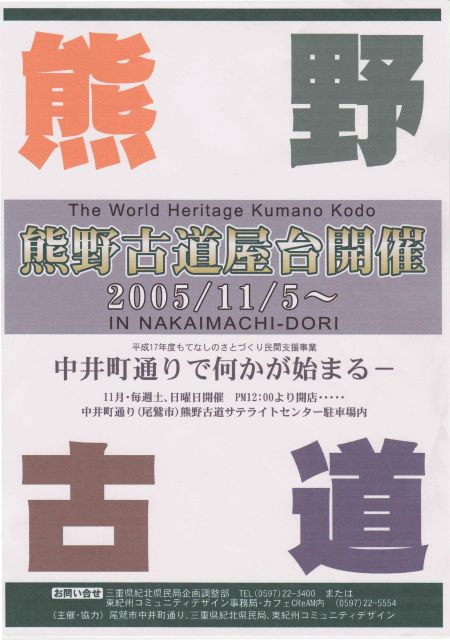 11月6日(日)から、毎週末に開催される熊野古道屋台を募集しています。 11月は、熊野古道客がたくさん訪れる月間ですので、馬越峠を越えてやってくる古道客に、いったい何を出せば売れるのかを、実践的にやろうと決めました。 尾鷲市の中井町通り(熊野古道センターサテライトオフィス駐車場)で出店できますので、31日(月)19時ごろから、紀北県民局1階で説明会を開催します。 興味のある方は、ご参加ください。 ミクシィ繋がりで出店しませんか。 よろしくお願いします。