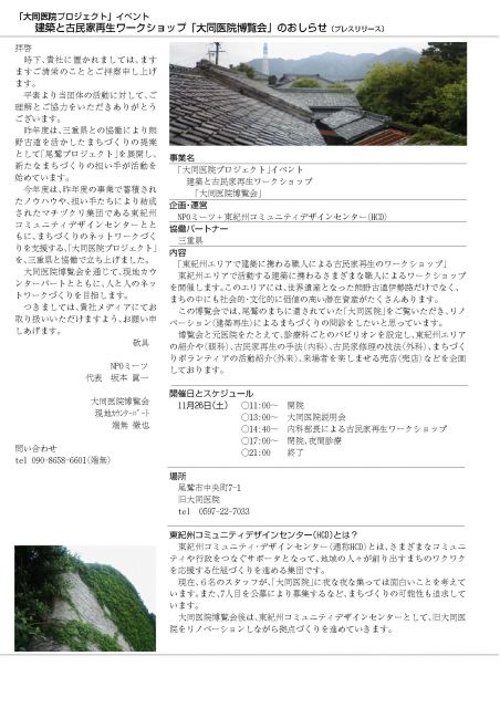 大同医院博覧会事務局の端無といいます。 この週末に、旧大同医院で、上記内容のイベントを開催します。 尾鷲をはじめとするこの地域には、世界遺産に指定された熊野古道伊勢路だけでなく、町の中にも歴史と趣のある文化的な資源が残されています。この資源を、絶やすことなく、後世に残していこうという取り組みを、旧大同医院という古民家を舞台に、博覧会形式でリノベーションしていくイベントになります。 当日は、建築関係の職人さんを広く募集するとともに、駄菓子屋や振る舞いなど、一般の方も参加できる大同市を同時開催しますので、ぜ