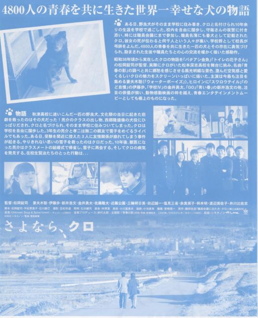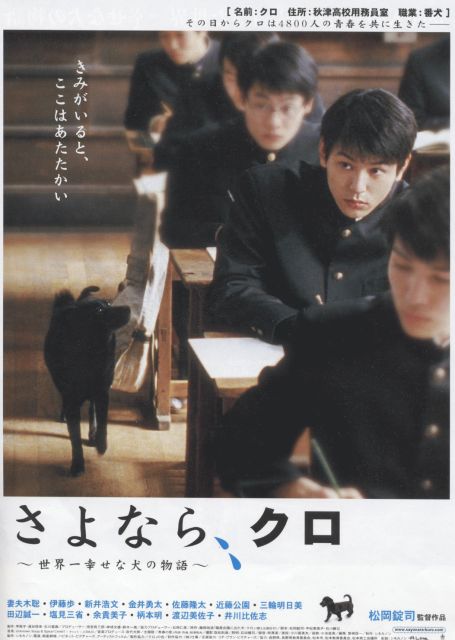 「ロマン座シネマ倶楽部」第10回上映会 「さよなら、クロ」(2003) 出 演: 妻夫木聡・伊藤歩・新井浩文・金意勇太・佐藤隆太 田辺誠一・塩見三省・余貴美子・柄本明・渡辺美佐子・井川比佐志 監 督: 松岡錠司 原 作: 藤岡改造「職員会議に出た犬・クロ」 日 時 11月26日(土)?19:30 27日(日)?10:30 ?13:00 ?15:30 会 場 尾鷲市栄町(旧リビングショップ西前)特設ミニシアター 会費制 1,000円 主 催 「ロマン座シネマ倶楽部」 「ロマン座シネマ倶楽部」は、19年前に閉館