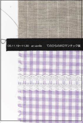管理人の雨です。 このたび友達4人で、三重のバニーユという雑貨店で 個展をやります。 お近くの方、雑貨好きの方はぜひ足を運んでくださいね。 ++++++++++++++++++++++++ ヴァニーユのHP http://www.zakkaya-vanille.com/ 「手のひらのロマンチック展」 11/19(sat)〜11/30(wed) +++++++++++++++++++++++++ 今回はロマンチックがテーマで、布小物、モビール、お菓子、ミニブック などなど、いろんな展示をします。 その中で、私は布小物担当で、コースター 鍋つかみ、エプロン など生活に密着した かわいいものに挑戦。