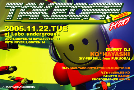 ★TAKEOFF★ 2005年11月22日(火)@Labo_underground(MIYAZAKI) みなさ〜ん、寒い季節になりましたが、どうお過ごしでしょうか?約2年ぶりに開催される「TAKEOFF(テイクオフ)」!!!!客室乗務員であるTAKEOFFスタッフがパスポートを持った皆様を近未来の国へ御招待っ!!今回、ゲストにDJ KO*HAYASHI(from FUKUOKA)を迎え、ハードかつアグレッシブで時にはソフトタッチのハッピネスっ?仮装してきたあなただけに素敵なプレゼントがあるんだって・・・。よっ!ふとっぱらッ〜!!!!機内では神楽酒造さんの「天孫降臨」で疲れた体をホイミっ!ピ