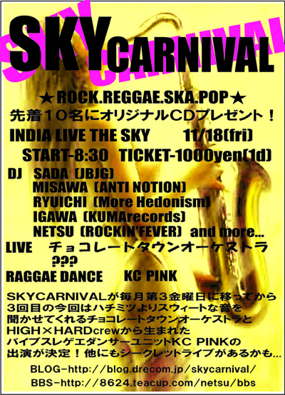 金曜日に移って早3回目の今回はライブににチョコレートタウンオーケストラ、sky carnivalでは初の試みのレゲェダンス☆KC PINKを向かえ、今月もオールジャンルパーティーやっちゃいます!