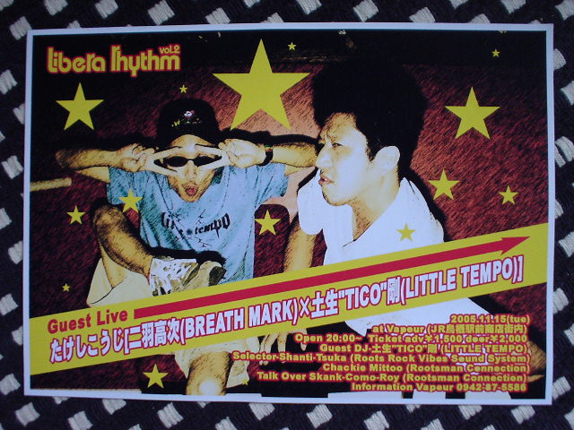 来週の火曜日に鳥栖【VAPEUR】にTICO(From LITTLE TEMPO)が登場します!!!DJ&LIVEというスペシャルな夜をみんなで楽しみましょう!!! 【Libera rhythm vol.2】 日時-11/15(火) 場所-Vapeur(JR鳥栖駅前商店街内) 時間-20:00〜 料金-adv¥1.500 door\2.000 Guest LIVE-たけしこうじ[二羽高次(BREATH MARK)× 土生"TICO"剛(LITTLE TEMPO)] Guest DJ-土生"TICO"剛(LITTLE TEMPO) Selector-Shanti-Tsuka(Roots Rock Vibes Sound System)Chackie Mittoo(Rootsman Connection) Talk Over Skank-Como-Roy(Root