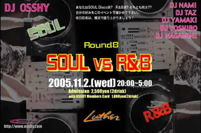 横浜の小さなソウルバーで毎回熱く行われているイベントです。 R&B、ソウル好きは必見ですよ! マイミクのやまきさんも回します! 当日はカメラ持って参加します! 2005.11.2(wed) 20:00〜5:00 @ yokohama Luther Admission ¥2,500 (2drink) 【アクセス】 横浜LUTHER 横浜市西区南幸2-10-18 東海屋ビル3F TEL 045-314-8993