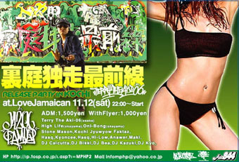 Aki-06アルバム「裏庭独走最前線」リリースツアーin高知 at.LoveJmaican 11.12(sat)22:00〜start ADM:1,000yen フライヤー持参で500yenOFFの1,000yen Guest:Aki-06(大阪),HIGHLIFE(岡山)ONI-BONG(岡山) Show:高知重要FAKTAZ,Kyoncee,Hasq,Hi-Low,Answer,Maki, DJ:StoneMason,Calcutta,Bikki,Bea,Kazuki,Kyo, 韻踏合組合やYouth、Shingo★西成、Hi-Kingらが所属の「420FAMILY」のリーダー、TerryTheAki-06が昨年夏にリリースツアーから再び高知に上陸。今回は420Family、そして高知でもお馴染みの岡山から「High-Life」もCDリリ
