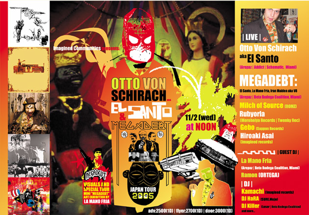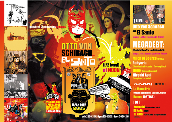 2005年、年内最後のイマコミは、遂に遂に!!!!!!!!!マイアミから奴が来日!!!!過去マイアミ最重要レーベル「Schematic」及び「BETA BODEGA COALITION」などから数多くのアルバム&シングルをリリース!!ヘビーメタルをそのままヒップホップのフォーマットにぶち込んだかのような凶暴でしかしどこかユーモアを感じさせる超ドープな作風で世界中のヘッズを虜にした『Otto Von Schirach』が、BETA BODEGA COALITIONの新レーベル「Arepaz」よりリリースされる、アルバム「El Golpe Avisa」のツアーで突如の来襲決定!!!!!