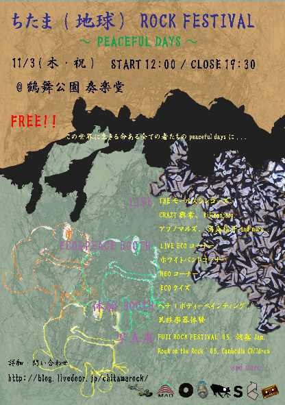 「ちたま(地球)ROCK FESTIVAL」 なるものを11月3日、名古屋の鶴舞公園にて開催します。 夏フェス好きが中心に作っちゃったイベント。 ライブの他、フジロック、朝霧JAMetc.の写真展やECO&PEACEブース、へナや民族楽器の体験コーナー等、イベントいっぱいです! ぜひ遊びに来てください♪ 詳細→http://blog.livedoor.jp/chitamarock/