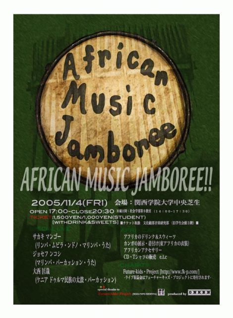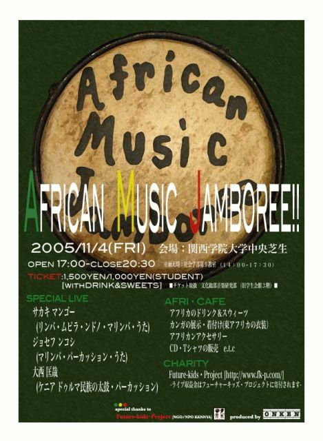 〜秋の月を眺めながらアフリカの音楽はいかがですか〜 ◆◆AFRICAN MUSIC JAMBOREE!!◆◆ 2005/11/4/FRIDAY 17:00~20:30 関西学院大学 中央芝生(野外) TICKET:1500YEN / 1000YEN(STUDENT) with Drink&Sweets :::LIVE MUSIC::: ●サカキ・マンゴー (リンバ/ムビラ/ンドノ/マリンバ/) ▲ジョゼフ・ンコシ (マリンバ/パーッカション) ■大西匡哉 (ケニア ドゥルマ民族の太鼓) 『AFRICAN MUSIC JAMBOREE!!』はアフリカの音楽はもちろんのこと、アフリカンカルチャーを紹介するイベントです