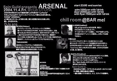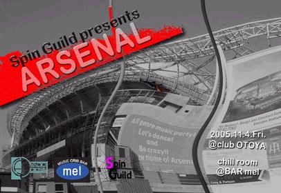 Spin Guild presents "ARSENAL"@音屋 2004.11.4.Friday Chill room BAR mel start 23:00 DJs:OKUDA(velour) TAKAHASHI U-KING(sailou) 天狗(mel) MuRAc0(sailou) adv:1000yen door2000yen with flyer:1500yen (all with 1 drink) 2005年9月BAR melで最高の盛り上げを見せた"La Festa" そのLa Festaがオールジャンルイベントとして生まれ変わる。 その名は"ARSENAL" より新たなスタイル、より新たな音、新たな空間がアナタを楽しませ、癒し、狂わせる。 chill roomとしてBAR melでも同時共催!!