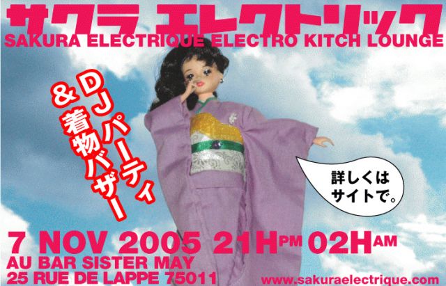 おまたせしました。 おなじみ、"SAKURAELECTRIQUE"開催決定!です。 11/7、バーsister mayにてentree libre。 ジャパニーズDJ Champignon、パリからDJ DB、DJ Kaijuのサクラ3DJで開催決定。 そして、スペシャルイベント”着物バザー”も同時開催。 soireeの詳細はHPでチェックしてください。 http://sakuraelectrique.com 着物バザーの出品予定商品はこちらから、、、 http://mixi.jp/view_bbs.pl?id=2226602 http://mixi.jp/view_bbs.pl?id=2226589 着物を購入された方には無料での着付けサービスも。。。 着付けだけを希望の