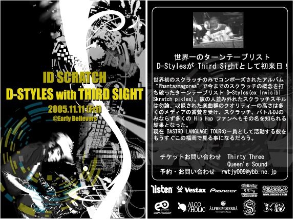 11月11日(FRI) at EARLY BELIVERS にて"IDENTITY SCRATCH"(ID SCRATCH)のイベントを行いますっ★なんと今回初来福、初九州上陸となるあの世界最強のスクラッチャー "D-STYLES" と DJ SHADOWお気に入りの"THIRD SIGHT" <D-STYLES+JIHAD>の超豪華なゲストを向かえております。