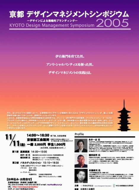 京都 デザインマネジメントシンポジウム ―デザインによる戦略的ブランディング―のお知らせです! サントリー伊右衛門や日産自動車、アップルコンピュータなどのブランディングに携わり、2004年度クリエイター・オブ・ザ・イヤー賞、2005年度ADC賞を受賞された永井一史氏、また、アンリ・シャルパンティエのブランディングで2004年度デザイン・エクセレント・カンパニー賞を受賞された蟻田尚邦氏の両氏をお招きし、デザインを軸としたブランディング、そして経営にデザインを取り入れる「デザインマネジメント」の手法や考え方について学んでゆ