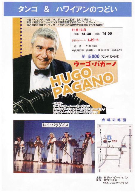 タンゴ&ハワイアンのつどい HUGO PAGANO & RAY PARADAISE ウーゴ・パガーノ&レイ・パラダイス 11月13日(日) 場所:多目的ホール レピート(送迎あり) 柏市藤心962番地 東武野田線高柳駅下車徒歩10分 当日高柳駅前にて送迎車あり information アビコ企画 TEL:047-171-1322(当日) 前日まで10時から6時04-7176-0945 又は終日090-1116-3282 本国アルゼンチンでは「バンドネオンの王様」として呼ばれ、非常に陽気なパフォーマンスで観客を魅了するウーゴ・パガーノ。気心知れた熟練アーティストたちによる情熱的で