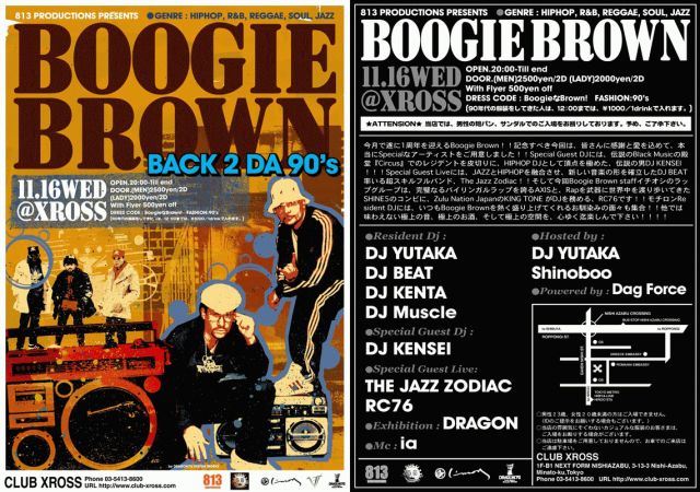 遂にBoogie Brownも今月で、1周年を迎えることになりました!! 今までの1年間、そしてこれからもBoogie Brownを支えて下さる皆様、本当にありがとうございます!!!! staff一同感謝と愛を込めて、今回は皆様を懐かしの90’s HIPHOPの時代にご招待します!! 今回のSpecial Guest DJには、20年前に六本木のshub-adでDJを始め、伝説のBlack Musicの殿堂Circusでのレジデントを皮切りに、HIPHOP DJとして頂点を極めた、伝説の男『DJ KENSEI』を迎えます!! Special Guest Liveには、JAZZとHIPHOP・Black Musicを融合させ、新しい音楽の形を確立し