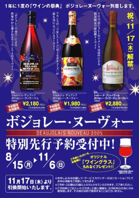 11月17日ってボジョレー・ヌーヴォの解禁日!!(≧∀≦ノイェーイ ってわけで、ボジョレー買ってきて、つまみでも作ってグビグビのんだくれる予定。 参加者は1人1本、ボジョレー購入の上、オイラん家集合でよろしく!!( ̄∀ ̄