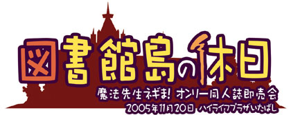 ライブというわけではないんですが。 ネギま! オンリー即売会にて、アフターイベントにバンドで参加します。 30分くらいの軽いやつですが、ネギま!ファンの方は是非是非。 『図書館島の休日』 http://toshokanjima.com/ ■ 参加方法 開催日時: 2005年11月20日(日) 場所: ハイライフプラザいたばし ネギま!オンリー即売会「図書館島の休日」アフターイベントにて 一人一冊、「図書館島の休日」のカタログをお買い求めください #11月上旬頃から販売開始予定 / イベント当日も発売