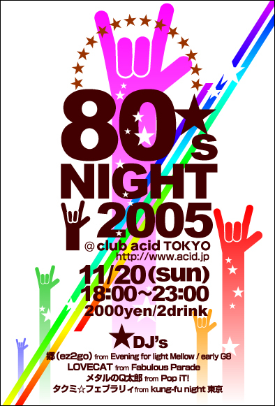 年に1度の「80's Night」がなんとアンコール開催。しかも前回欠席だった紅一点マチュドンナが急遽参加決定!80年代を代表するヒット曲の応酬、DJは80'sアーティストのコスプレ&ネタの応酬!!懐かしい人はあの頃の思い出と共に、NWリヴァイバルな今しか知らない人もお勉強がてらに、是非遊びにいらしてください。 【80's Night 2005 Encore】 11/20(日)18:00〜23:00 ¥2,000(w/2d) @新宿 rags room ACID (http://www.acid.jp) DJ: ・郷(evening for light mellow / early G8) ・Takumi February6(如月タクミ from Kung-fu Night 東京 /