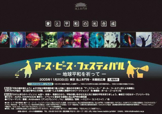 地球平和を願うイベントに参加します。 争いのない美しい地球を取り戻す願いを蓮に託して 声明法要とBlue Lotusがセッションします。 アースピースフェスティバル -地球平和を願って- 2005年11月20日(日) 池上本門寺・本殿前広場 入場無料 13:00〜19:15 出演者・協力者 Ambivalent OVERHEADS AURA 谷口朋子 内藤忠行 一十三十一 ポール・コールマン 山北健一 アースピースフェスティバル http://www.mediatv.jp/ikiiki/epf/index.html Tadayuki Naitoh official site http://www.p-om.net 池上本