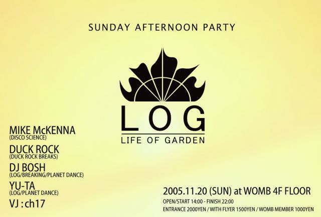 LOG -LIFE OF GARDEN- at WOMB 4F FLOOR 11/20(SUN)14:00-22:00 ■RESIDENT DJ DJ BOSH YU-TA ■GUEST DJ DUCK ROCK MIKE McKENNA ■VJ ch17 ■FOOD GACHA-3D(エントランスにてメニューを配ります) INFOMATION : http://www.womb.co.jp/