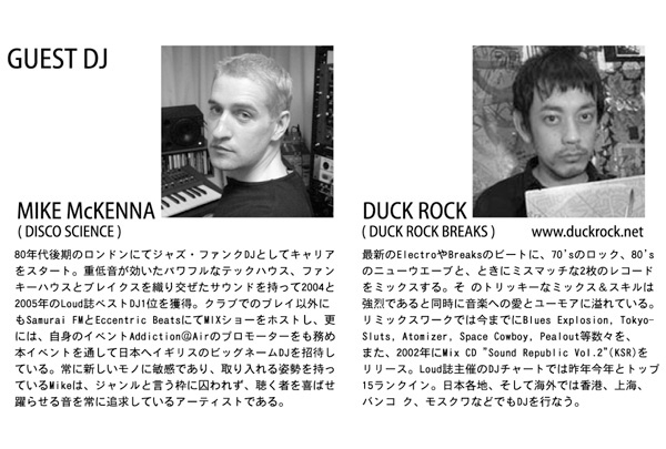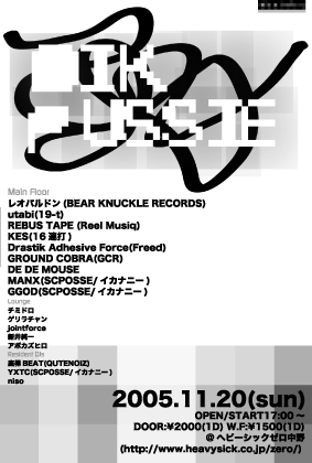 2005.11.20(sun) OPEN/START17:00〜 DOOR:\2000(1D) W.F:\1500(1D) @ヘビーシックゼロ中野 (http://www.heavysick.co.jp/zero/) 変態モジュール音頭にもうムラムラ?? 日曜日は家でマウスカチカチしてる場合じゃない! PCを捨てクラブに出よ、デーアイケーなパーリー[DIK PUSSIE]!!! レオパルドンにREBUSTAPE、utabiやKESが繋ぐ 電波流しまくりのBEATに中野地下は一触即発!!!勃起寸前!!!!容量限界!!!! 当日はイベント限定日本酒(?)を販売!powered by喜久盛酒造 iTunesにてDIKキャスティング配信決定!?! 交互期待!!! -MAIN FLOOR