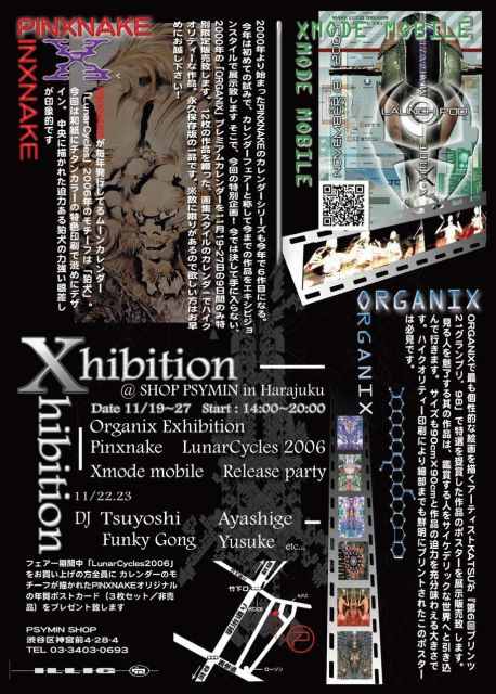 告知失礼いたします。 原宿のPsyminにてPinxnake, Organixの展示会を行ってます。 作品は本当にかっこいいものばかりで見逃すにはもったいない!! 今までのムーンカレンダーも展示しており2006年の新作もあります。フェア期間中はカレンダーと一緒に Pinxnake非売品年賀状もプレゼントします! 今回は特別に2000年のOrganixカレンダー作品も発売してます。 11月22日(火)はイベントも企画して、 DJ Tsuyoshiがプレーします!! いい音楽で、素敵な絵と楽しいVibeでお待ちしております! 展覧会詳細 19日〜27日 12