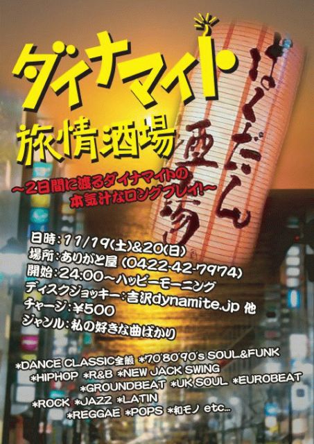 今回は2daysということで。 皆さんどちらかいらしてください。 もちろん両日いらしていただいても。。 11/19(土)・20(日) DJ 吉沢dynamite.jp and more...