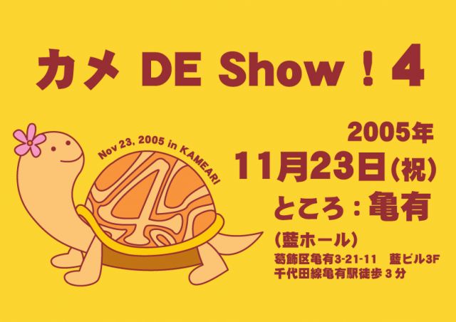 日時:11月23日(祝) 11時オープン 17時クローズ(入場は16時半まで) 亀有 藍ホールにて亀オンリーのグッズ販売会+オフ会が開催されます! 他では会うことが出来ない、手作り亀さんがたくさん集まります!是非! 詳しくは http://shopkame.com/show/show.htm
