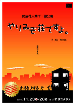 第…何代なんだろう…94年入学の小松です。 今は役者をしてまして舞台やらラジオドラマやら 大して金にならないことばかりしております。 コミュに参加した際に「公演時はイベント立てて」と お許しを頂いたので、アップ致します。 最近では集客数が1,000人超えて当たり前という 割とまあ人気上昇中の劇団と思いますし こむずかしいこと一切無しのコメディですので 演劇に馴染みのない方も是非足をお運びください♪ ---- 開店花火第十一回公演 『やりみぞ荘ですよ。』 劇団HP http://kaitenhanabi.com/ 築40年はあろうかという