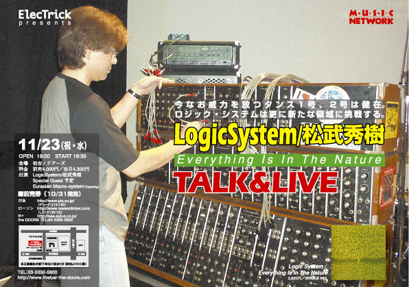 「松武秀樹」 「YMO」 「シンセサイザー」 「moog」 「たち くらみ」 この言葉でビビッときた皆様に "LogicSystem/松武秀樹TALK&LIVE"のお知らせです。 ■松武 秀樹 / Hideki Matsutake / Logic System http://www.midipal.co.jp/~logic ■"LogicSystem/松武秀樹TALK&LIVE"告知サイト http://www.electrick.jp/logic/ デジタル系楽器/レコーディング機器のお勉強マガジン 「DiGiRECO(http://www.digireco.com/)」 編集長 三谷佳之氏談です。 ================================================== 11月