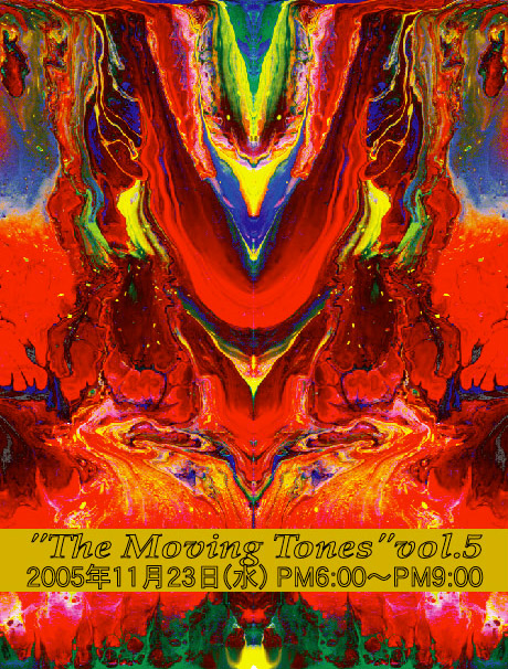 The Moving Tones vol.5 2005年11月23日(水) PM6:00〜PM9:30 2000円(1drink) お店は午前11時から開いています。 早めに来て頂いてもOKです。 PAGATENORARU(シンセサイザー即興演奏) http://www.h2.dion.ne.jp/~thunder/ http://mixi.jp/show_friend.pl?id=162792 miu∽myu(堀川ひとみ Vo. 伊藤昭彦 Gt.) http://www.aa.alpha-net.ne.jp/anjiking/miumyu/ (ホリカワヒトミ) http://mixi.jp/show_friend.pl?id=208156 (きんぐ@ギター弾き) http://mixi.jp/show_friend.pl?id=208001 及川禅(エレキギター他) http://mixi.jp/show
