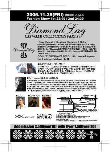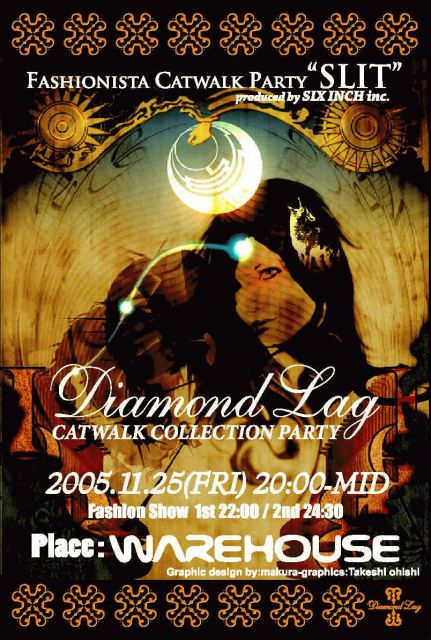 このコンセプトで渋谷109 B2FのショップDiamond Layが麻布十番のWarehouseでCollectionパーティーを行います。ダンスフロアに設置したCatwalkで2度のShowを行い、同時にTrance界からはDJ Kotaro (Equinox/Wakyo)、そしてProgressive/Tribal House界からはDJ D & Micthが参加・・・そのほかにも広末恵子のDJ、さらにはゲストパフォーマンスとして'ZAE'が色彩豊かなステージを披露します♪