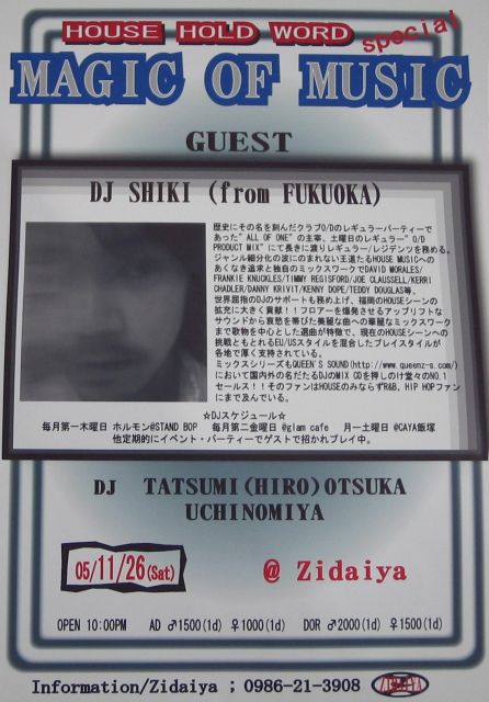 九州を代表するDJ SHIKIが26日に牟田町のZIDAIYAにやって来ます。彼の暖かいサウンドで盛り上がりましょう! ★BIOGRAPHY★ O/Dのレギュラーパーティであった"ALL OF ONE"の主宰、土曜日のレギュラー"O/D PRODUCT MIX"にて長きに渡りレギュラー/レジデンツを務める。福岡のHOUSEシーンに大きく貢献し、細分化の波にとらわれない王道たるHOUSE MUSICへのあくなき追求と選曲のミックスワークでDAVID MORALES / FRANKIE KNUCKLES / TIMMY REGISFORD / JOE CLAUSSELL / KERRI CHANDLER / DANNY KRIVIT / KENNY DOPE / TEDDY DOUGLAS等の世界屈指の大御所
