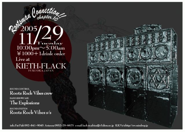 Rootsman Connection chapter.10 --- 2005.11.29(tue) 22:00start**@KIETH FLACK(fukuoka) DAY:1,000yen+1drink** ----------- Dj ------------ □RootsRockVibes Crew --------- BAND ---------- □The Explosions ------ Sound System ------- □RootsRockVibes Sound System info>>>FAT FISH:092-841-9045 ANTENNA:092-29-6675 RootsRockVibes>>> http://rrv.raindrop.jp/