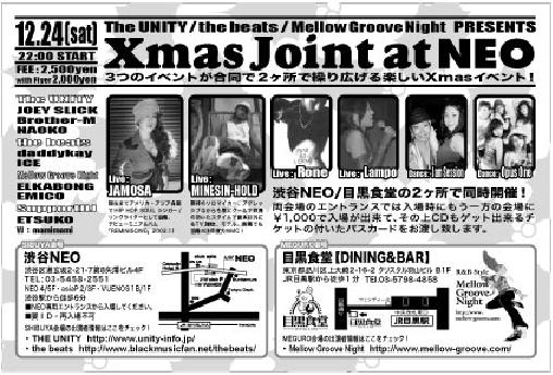 the beats / THE UNITY / Mellow Groove Night PRESENTS "XMAS JOINT" ★3つのイベントが合同で2ヶ所で繰り広げる楽しいXmasイベントです! ★渋谷NEO/目黒食堂の2ヶ所で同時開催!両会場のエントランスでは入場時にもう一方の会場に ¥1,000で入場が出来て、更に特製Mix CD(2枚入)もゲット出来るチケットの付いたパスカードをお渡し致します。 ★渋谷会場では先着100名様に特製Mix CDをプレゼント!(お1人・1枚限り) ☆渋谷会場(NEO)の情報 ■DATE : 12/24(Sat) 22:00 START! ■PLA